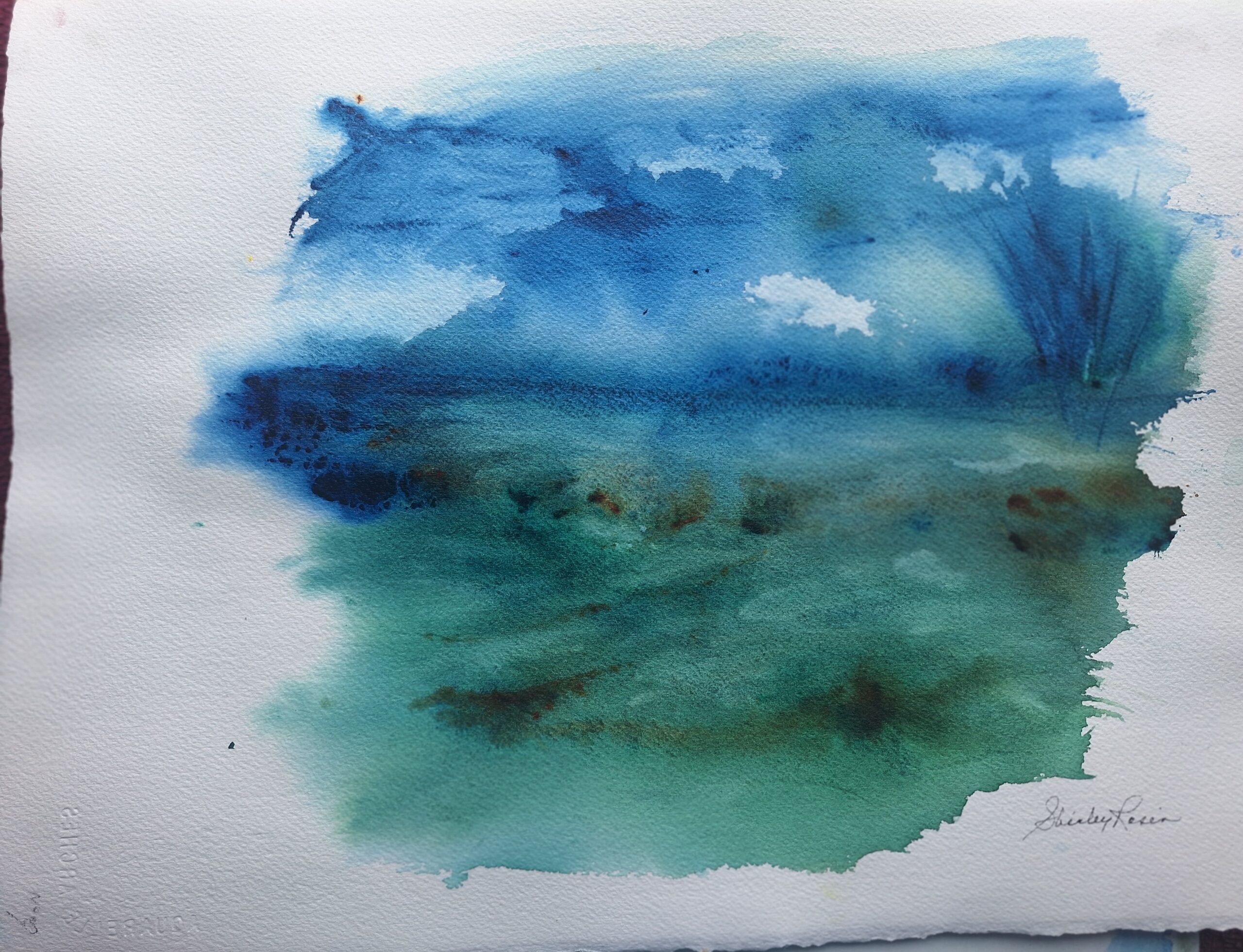 Dreamy Vista at Dusk presents a serene abstract landscape where deep blues dominate the composition, evoking the quiet calm of evening light. These rich tones gradually transition into layered hues of green and warm brown, suggesting landforms gently emerging from the fading day. The smooth blending of colors creates a sense of depth and movement, while the absence of defined shapes allows the viewer’s imagination to wander freely. The painting captures a tranquil, almost meditative atmosphere, reflecting the softness of dusk and the peaceful pause between daylight and night.