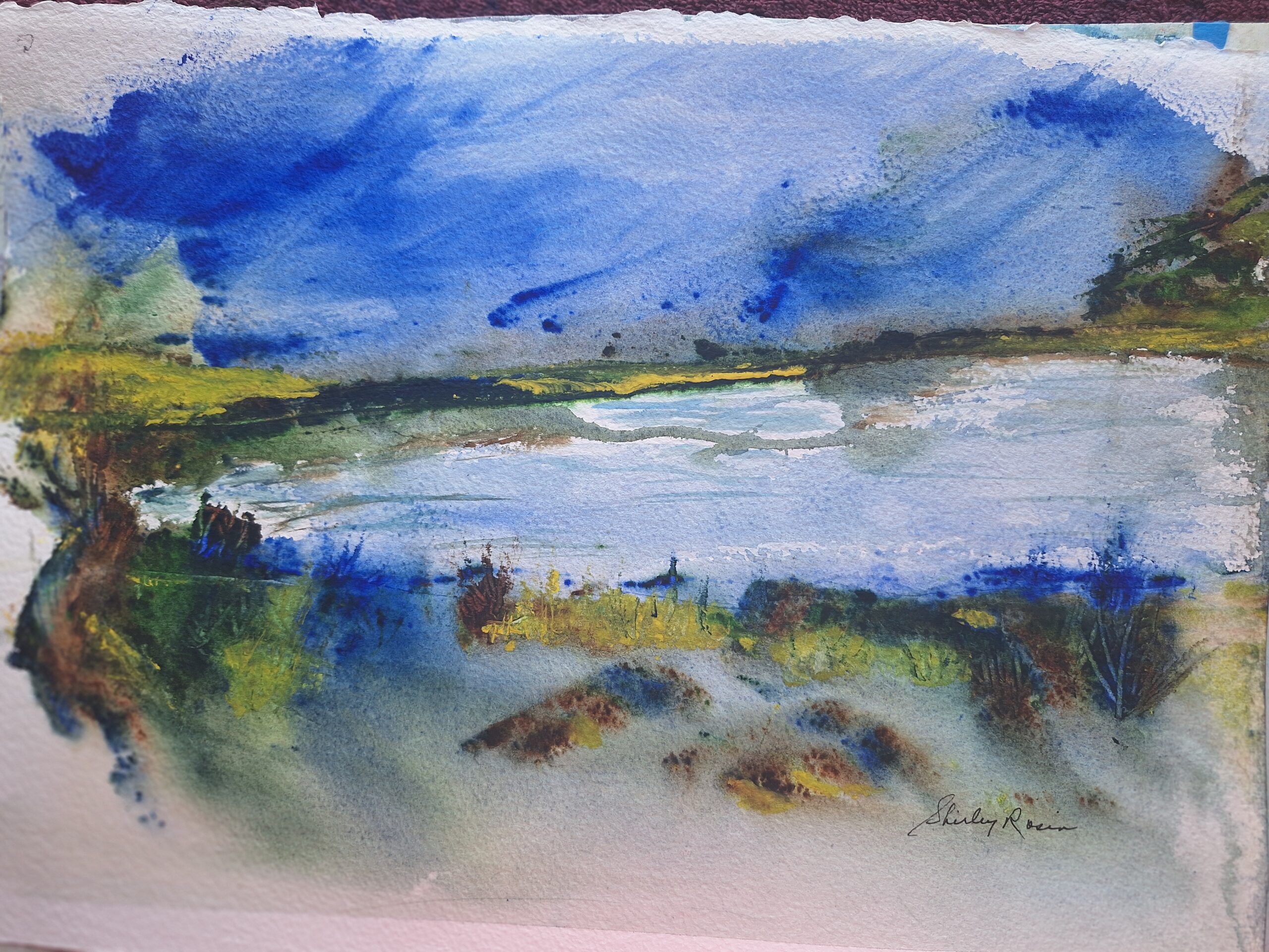 This painting is dominated by a vast body of water, likely a lake, stretching across the composition with a luminous presence. The surface reflects light, creating a bright, shimmering effect that adds movement and visual depth. Surrounding the water are patches of land rendered in varied textures and earthy colors, suggesting natural vegetation such as rolling hills and open fields. These contrasting elements add balance and structure to the scene. Above, the sky shows expressive movement through layered tones and flowing forms, enhancing the sense of atmosphere. Together, these elements contribute to a calm, harmonious natural setting that feels both expansive and tranquil.